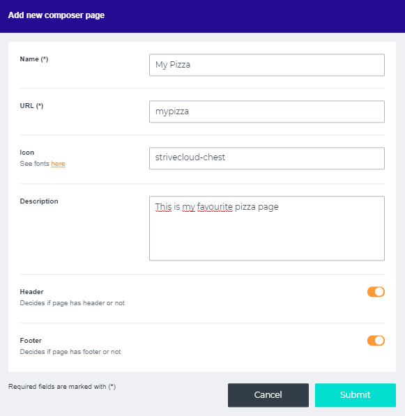 Name: Pick a name for your page. URL: Enter the internal web link of your composed page. Icon: Select the icon of your choice by picking one from the fonts list. Copy the code from the list and paste it into the field. Ex: strivecloud-chest Description: Provide your composer page with some additional information. Header: Toggle on/off to enable/ disable your header on the page. Footer: Toggle on/off to enable/disable your footer on the page. The footer consists of your linked socials |