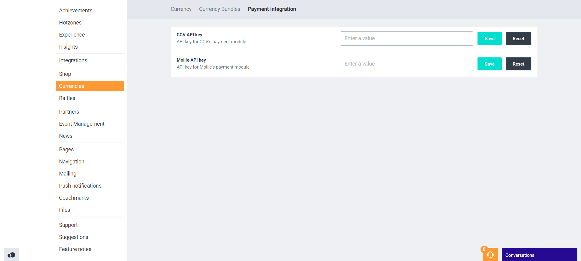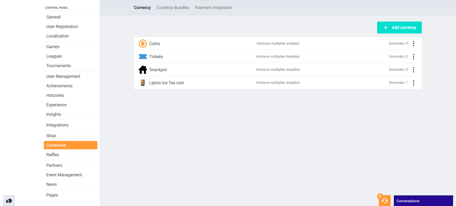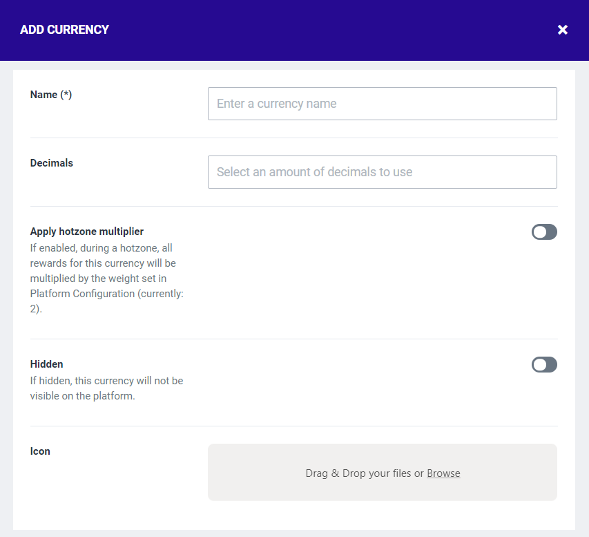 Name: Submit a name for the currency. Decimals: Determine whether the numerical value of the currency can consist of multiple decimals or not. Apply hotzone multiplier: Determine whether this currency will be affected by the hotzone multiplier when the hotzones are active. Hidden: Determine whether the currency is visible on the platform or not. Icon: Upload an icon to visually represent the currency. | ![]() |