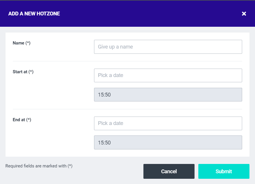 Name: Give the hotzone a certain name. Start at: Determines the date and hour at which the hotzone will commence. Ends at: Determines the date and hour at which the hotzone will end. | ![]() |