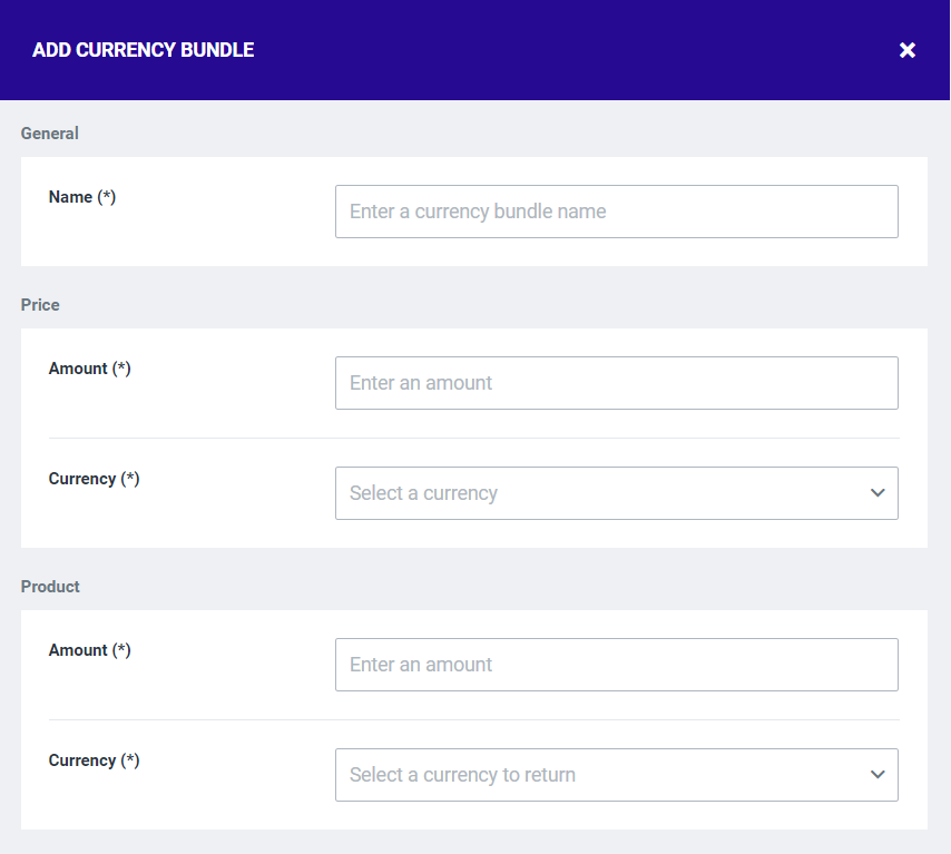 Name: Submit a name for the currency bundle as displayed in the shop. Price: The type and amount of currency to pay.