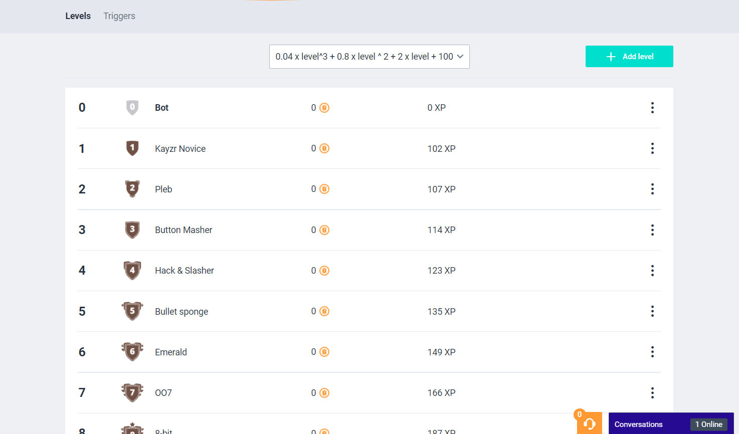 Set up the amount of levels the users can reach on the platform. Each level needs to be added individually. The experience needed for each level is needed is determined by an algorithm.