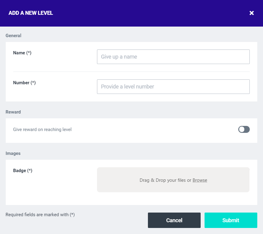 Note: only submit the numerical value Reward Determines the amount of currency awarded to the user upon gaining a level. Reward currency Choose a currency to assign as a reward for the acquired level. Badge Choose an image of your choice as an icon for the acquired level. | ![]() |