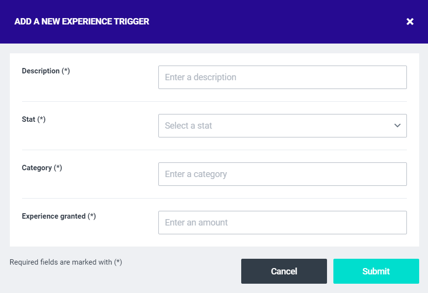 Name Give the trigger an appropriate name. Stat Connect this trigger with a stat to complete. Category Triggers can be categorised in different categories, choose the appropriate one here. Experience granted Determines the amount of experience points gained when the stat is completed and the trigger is activated. | ![]() |