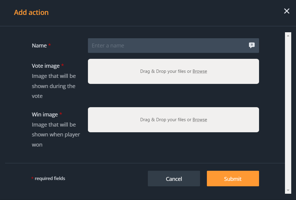 Name: Enter the name of the player. Vote image: Enter the image to display during the votings. Win image: Enter the image to display whenever this player won the votings. | ![]() |