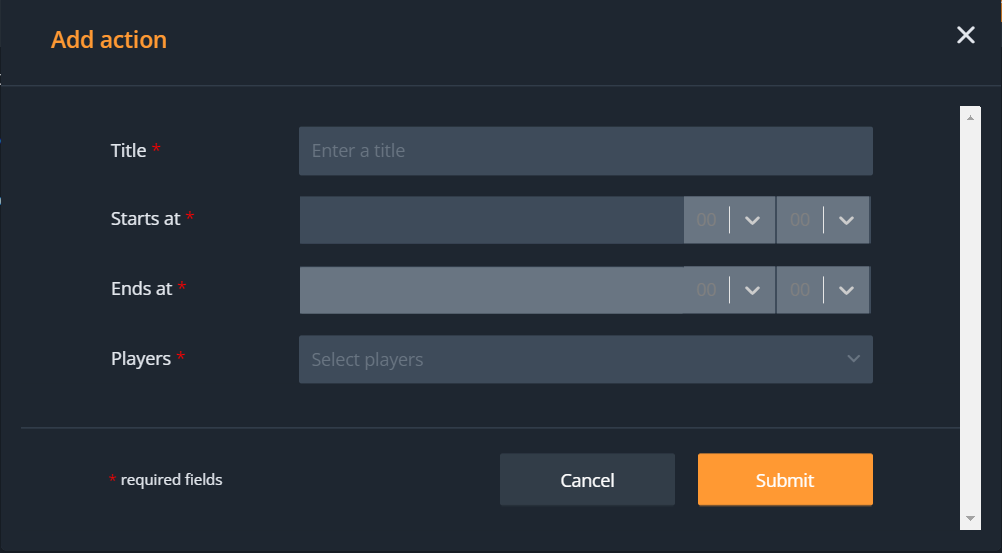 Title: Submit a name for the man of the match Starts at: Select a starting date and time. Ends at: Select an ending date and time Players: Select the players you want to compete for the man of the match title. | ![]() |