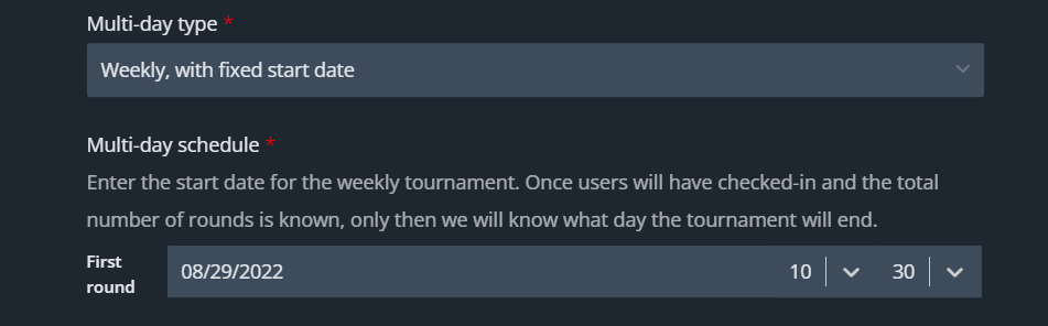 Once you have selected the time interval you’ll have to determine the start/end date, this will determine the date of the first or last round of the multi-day tournament:
