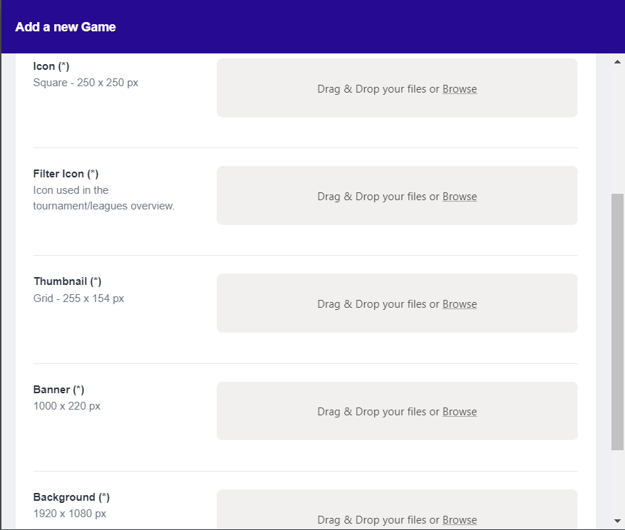 Before any tournaments or leagues can be created, it’s required to link the supported games to the platform.