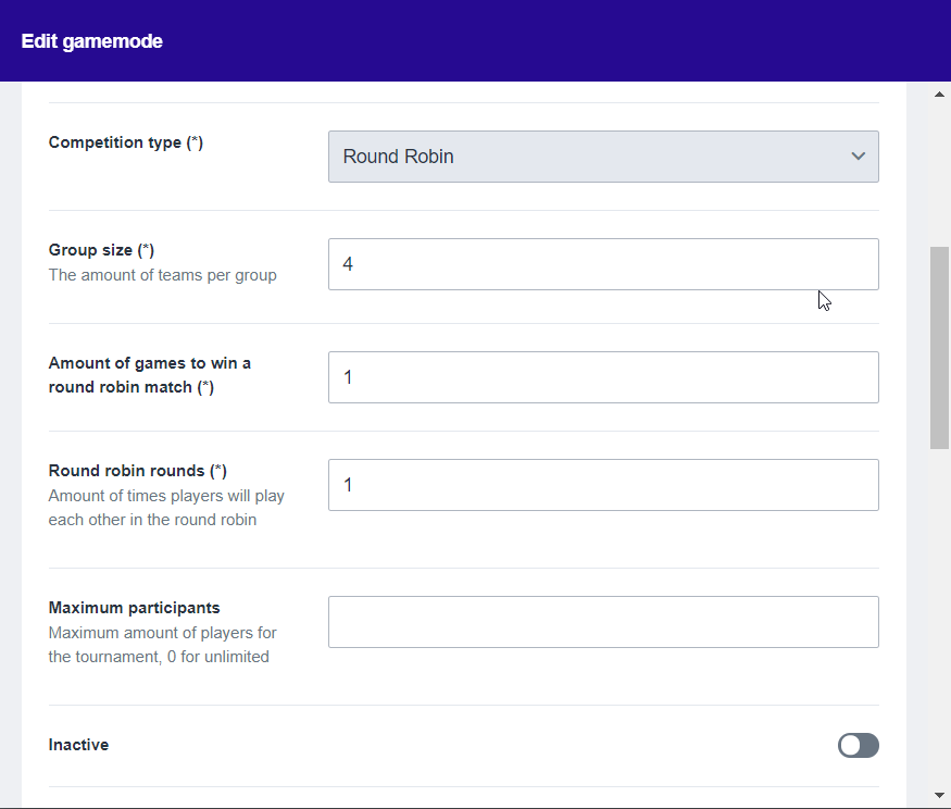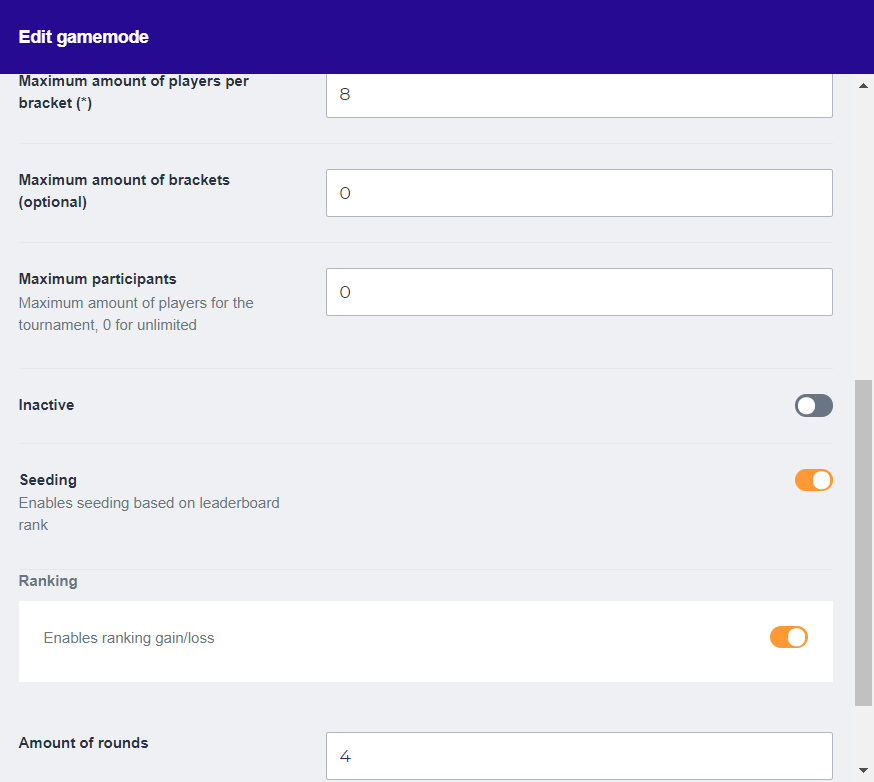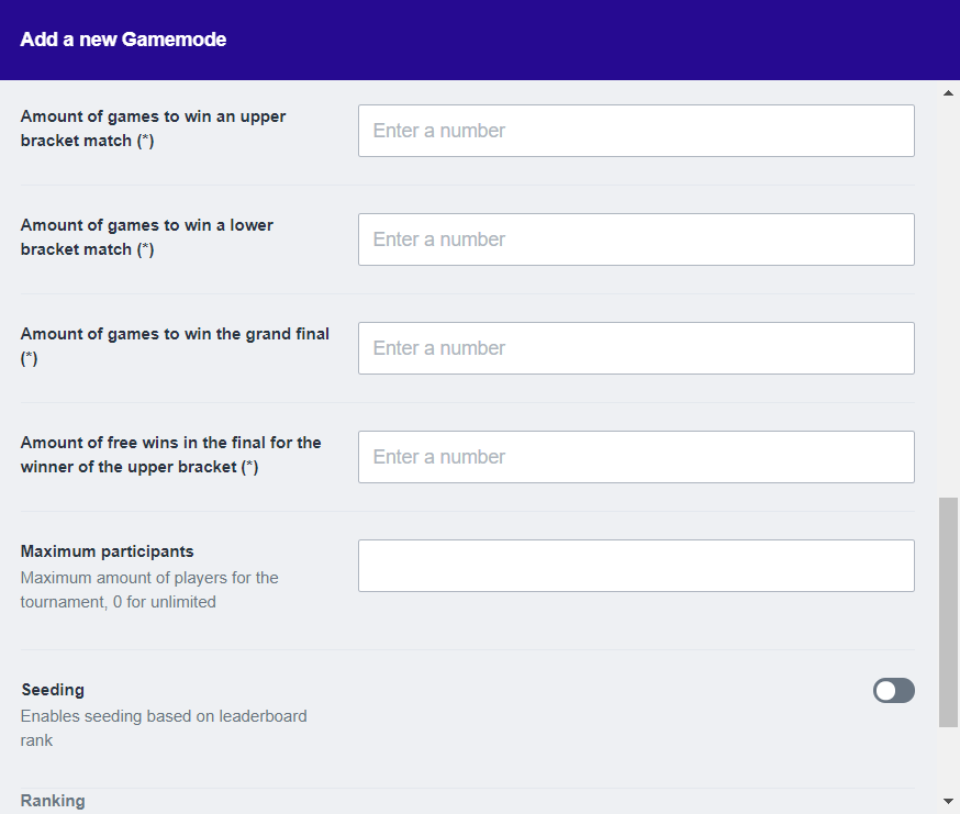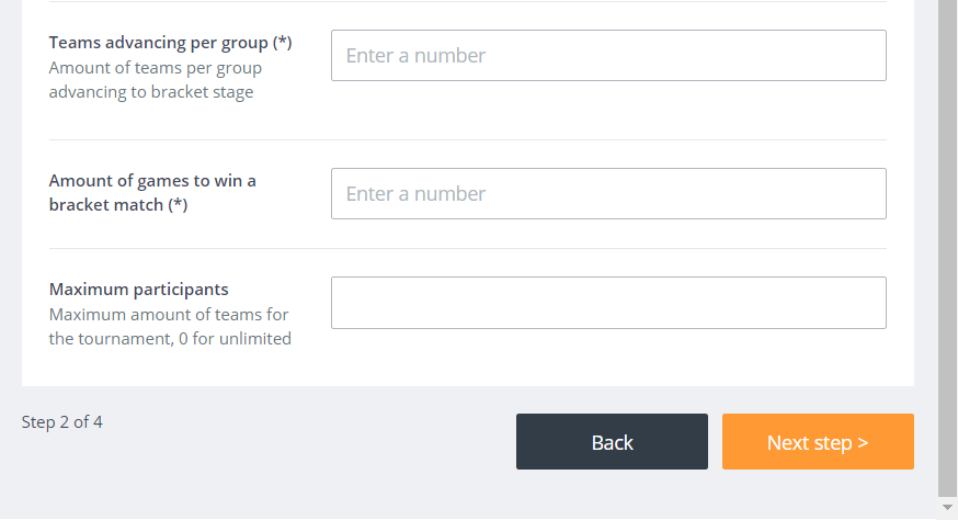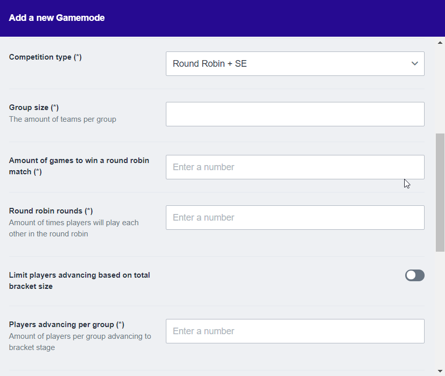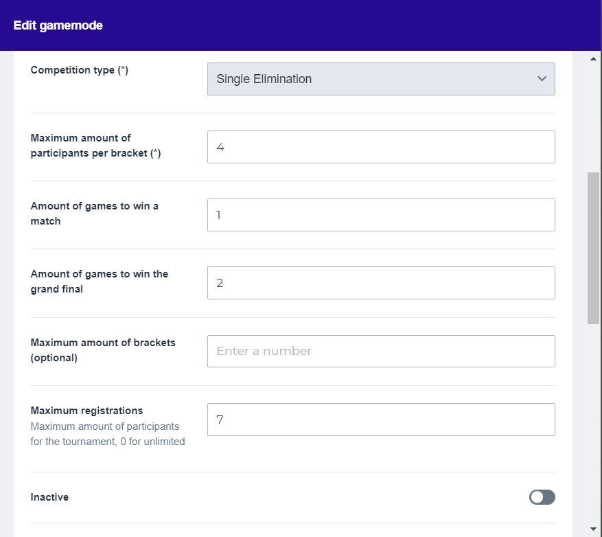 Now that you’re familiar with the concept of single elimination, we can set up the game mode. You’ll have to fill in the following fields correctly: