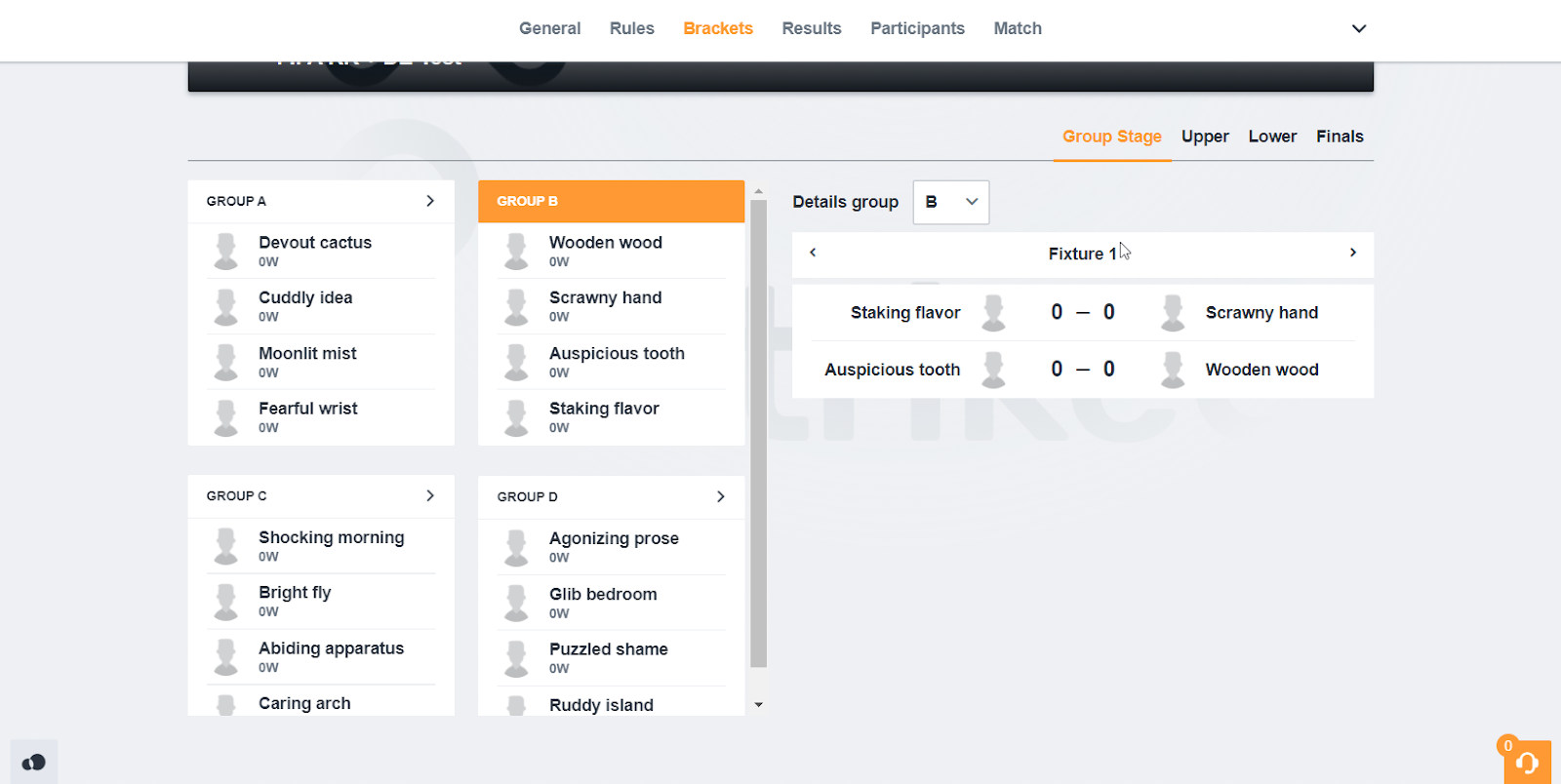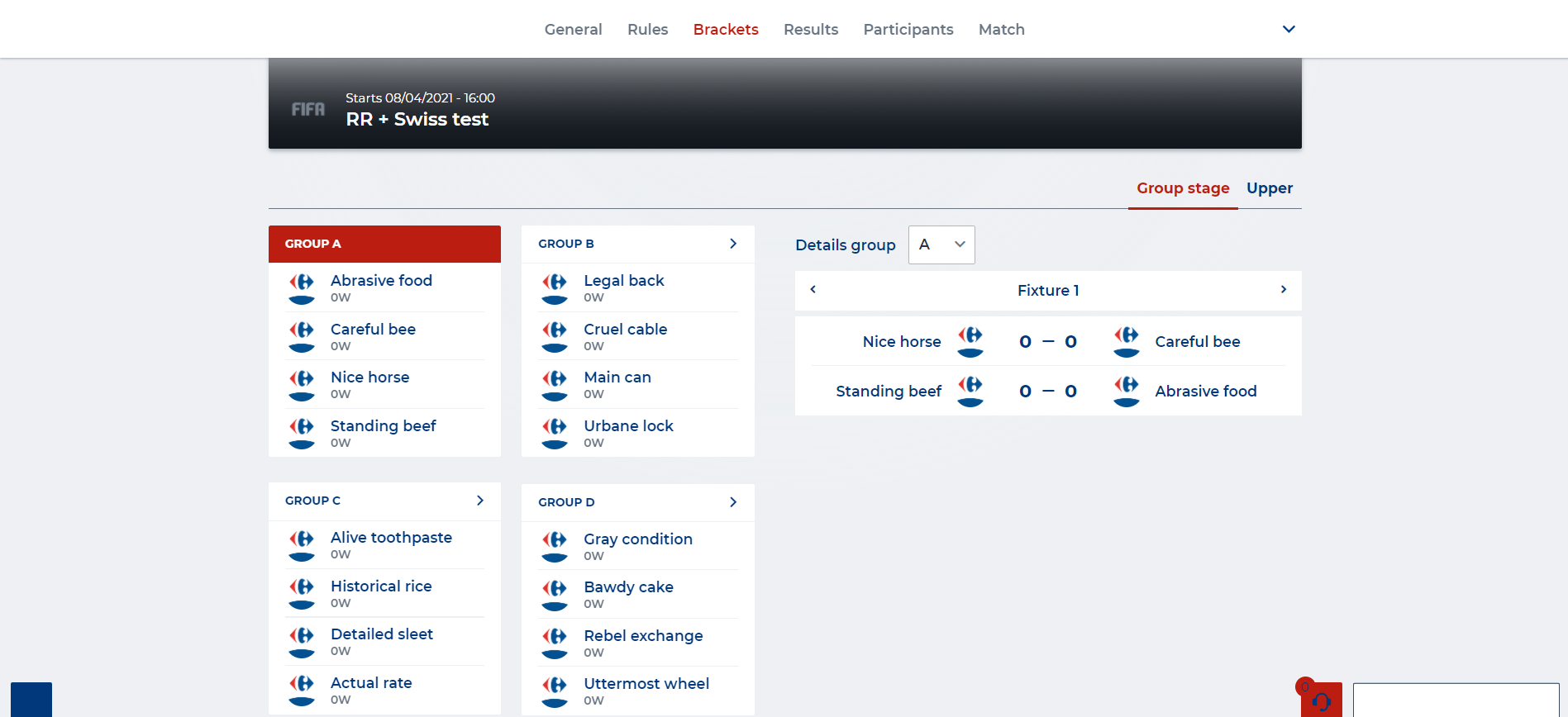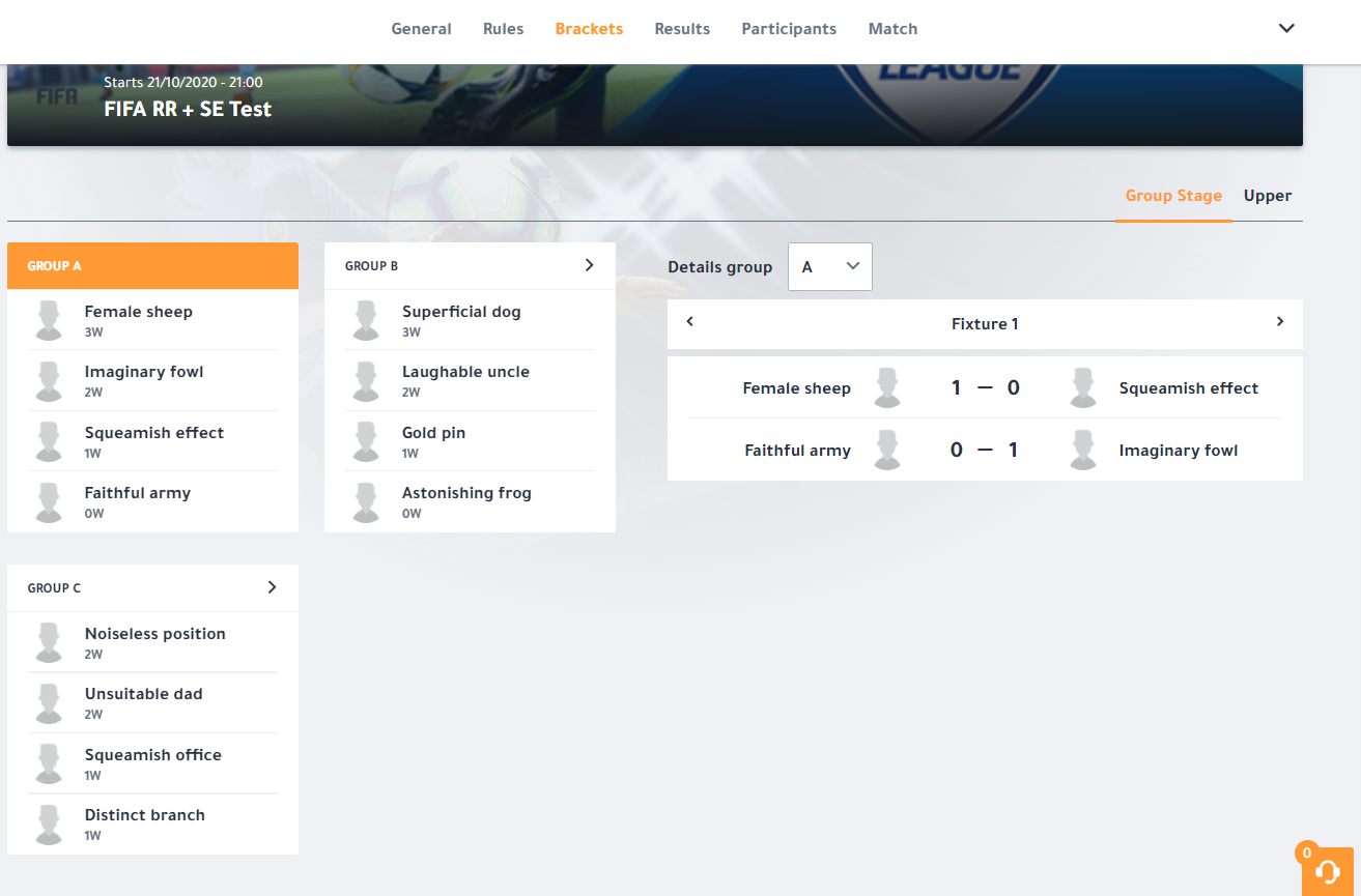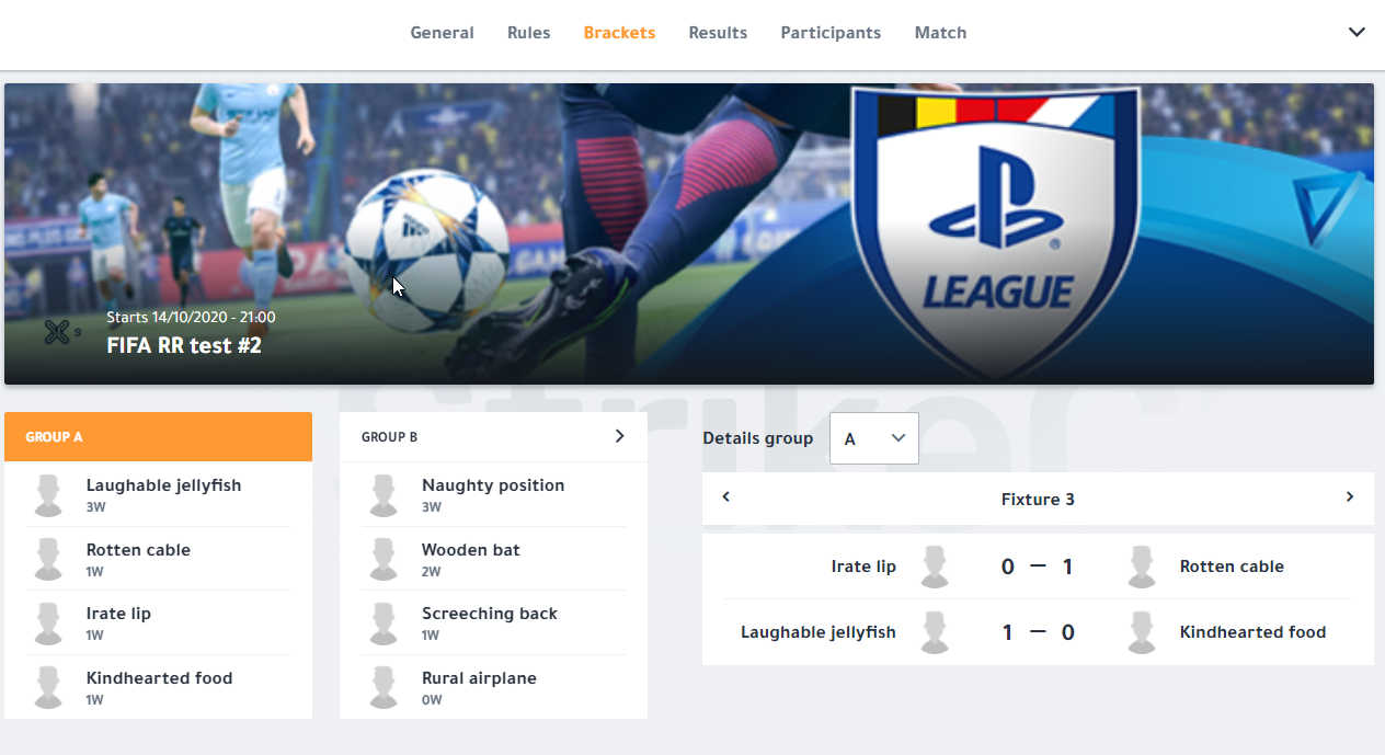 Ex. In a group with 4 participants each participant will play a single time against each other, resulting in 3 fixtures that need to be played. See the ‘brackets’ screenshot.