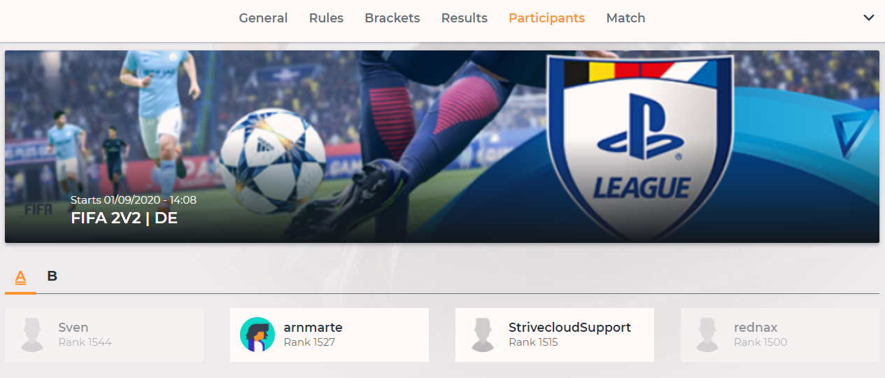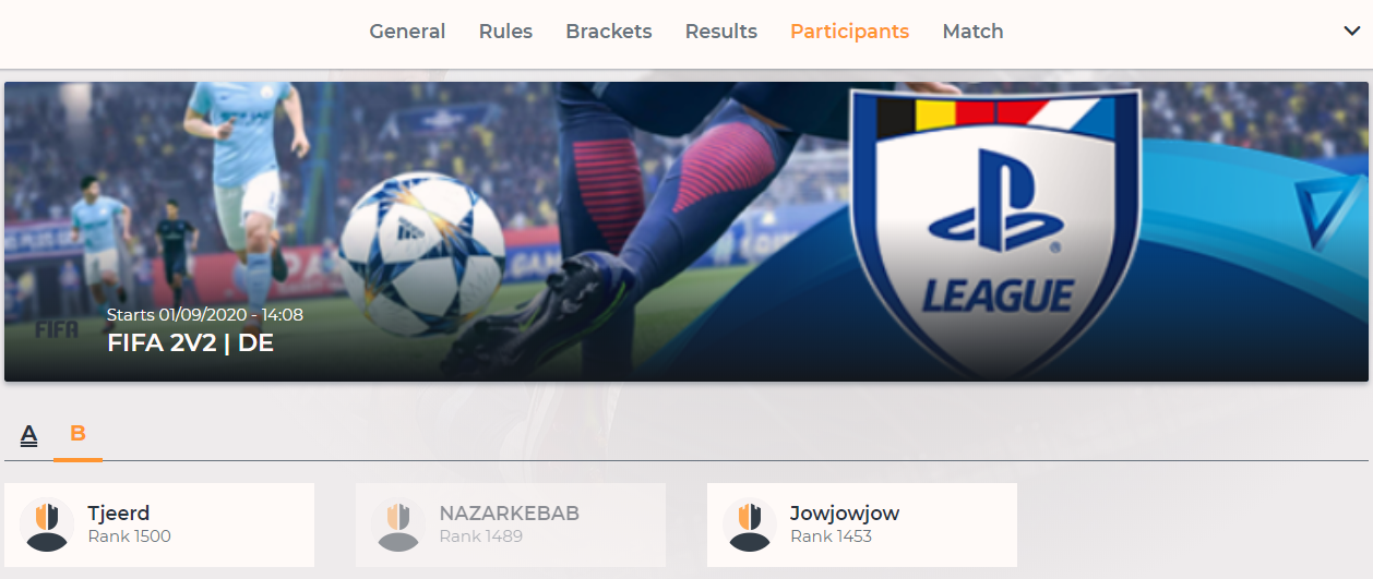 The amount of participants that signed up equals 7 participants. Since we decided that the maximum number of participants per bracket is limited to a maximum of 4; we have 4 participants in bracket A and the other participants in bracket B. As seen in the ‘Participants’ tab, this will look like this: