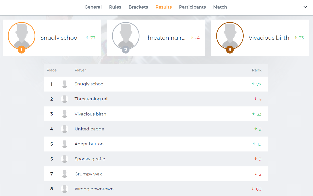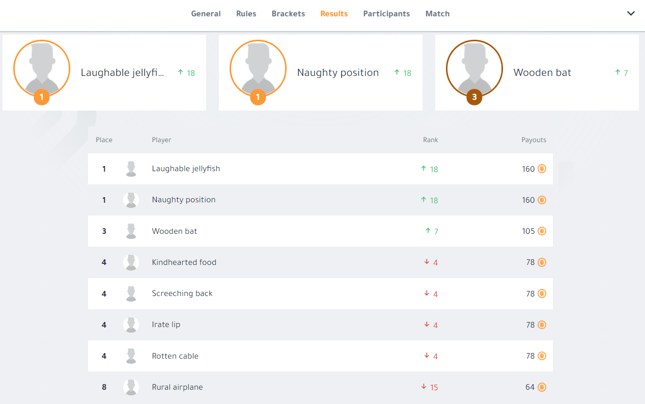 At the end of the tournament there will be a leaderboard consisting of 8 participants in a ranked order. The tournament overview will always provide the participants with the position they are competing for at that very moment.