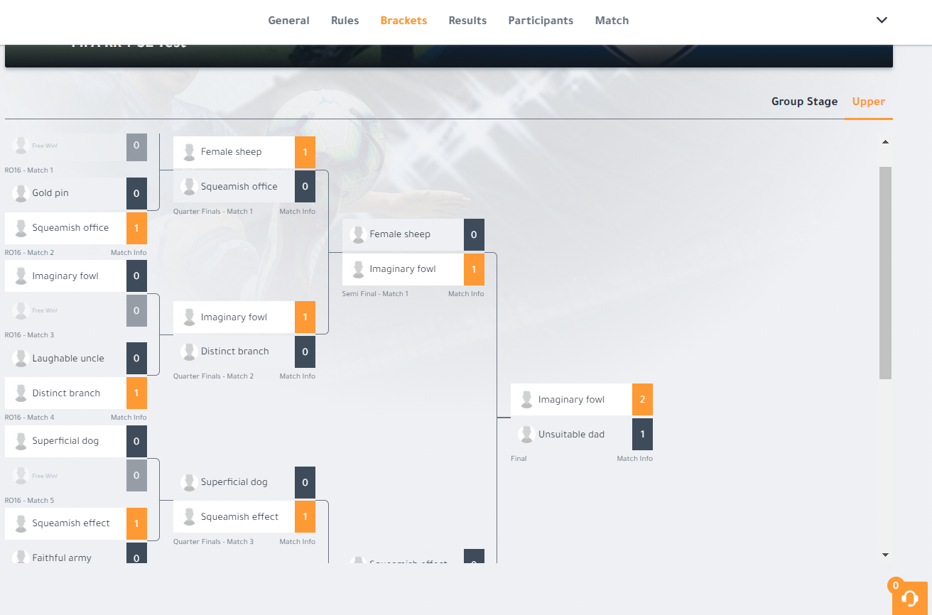 When all the fixtures are played, the tournament forms an upper bracket where a single elimination part will eventually decide who’s the winner of the tournament. The single elimination stage can be seen by clicking the ‘Upper’ window. This could look something like this: