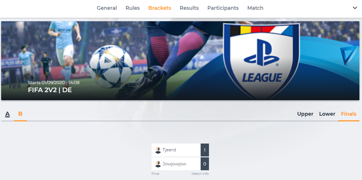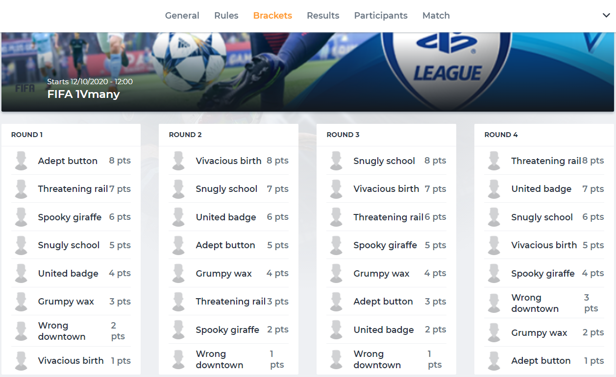 The more fixtures a participant wins, the higher he’ll rank on the leaderboard. The amount of wins are illustrated by the ‘#W’ underneath a player’s name in the ‘brackets’ window. The eventual end result after all the fixtures are played, can be seen in the ‘results’ window.
