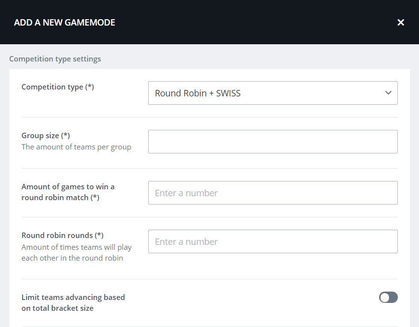 The general set up of the Round Robin game mode is the same as with other game modes, up until you select ‘Round Robin + Swiss game mode’ as the competition type that will be used. After selecting the competition type of your choice, you’ll have to fill in the following fields correctly: