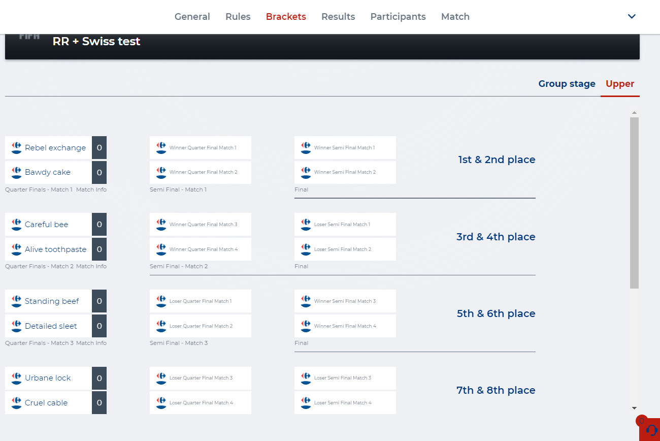 Notice how there’s only 8 of 16 participants in total left, as determined by the ‘Limit players advancing based on total bracket size’ setting. From every round robin group, there’s only 2 participants that will advance. In this case four groups with 2 partcipants each, results in a Swiss game mode consisting of 8 participants.