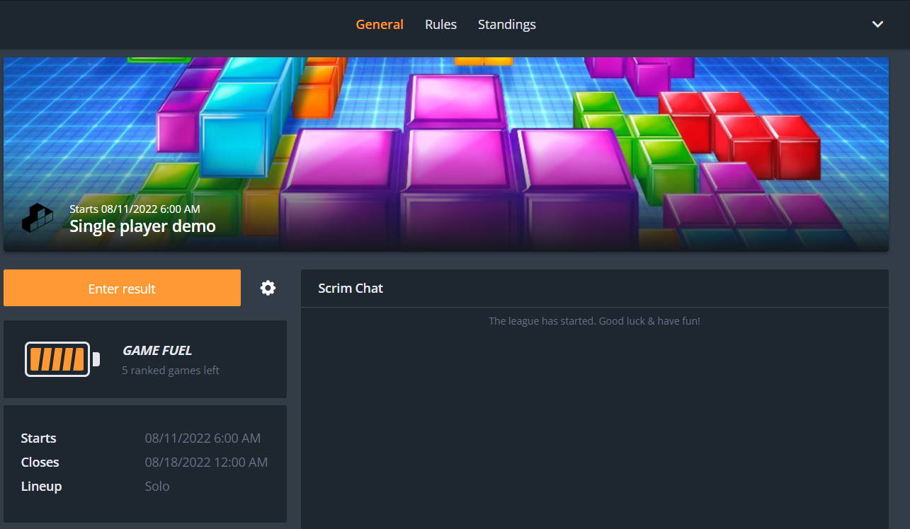 After signing up for the league, every player can submit their own score type (as determined during the single player game mode set up). Click the ‘Enter result’ button.