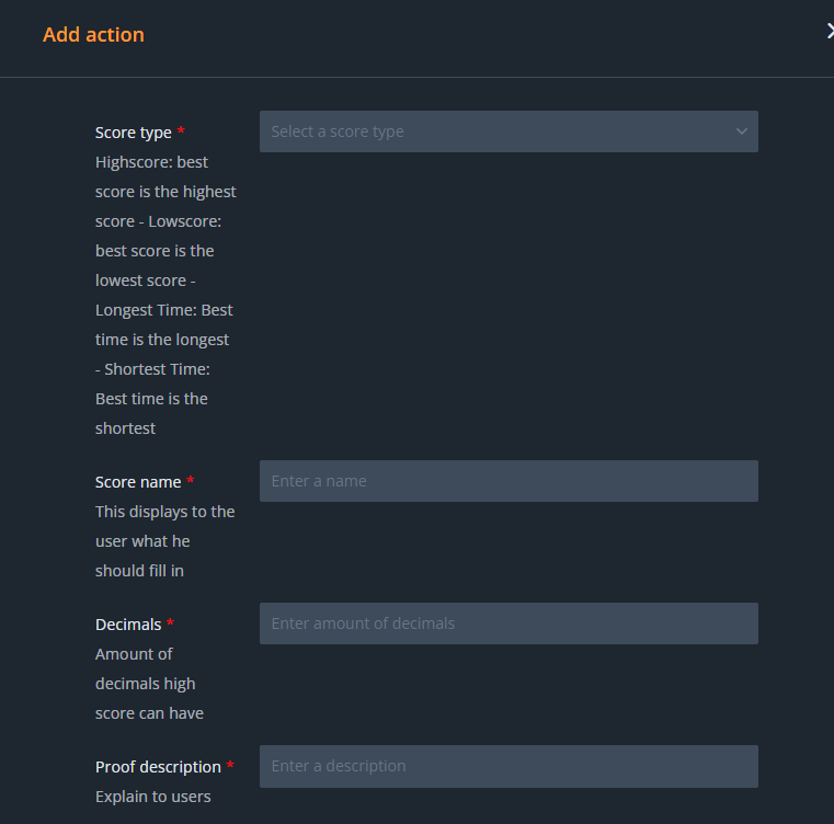 Score type: determine the type of score you want the player to reach. This can be a high score, low score, highest time or lowest time.