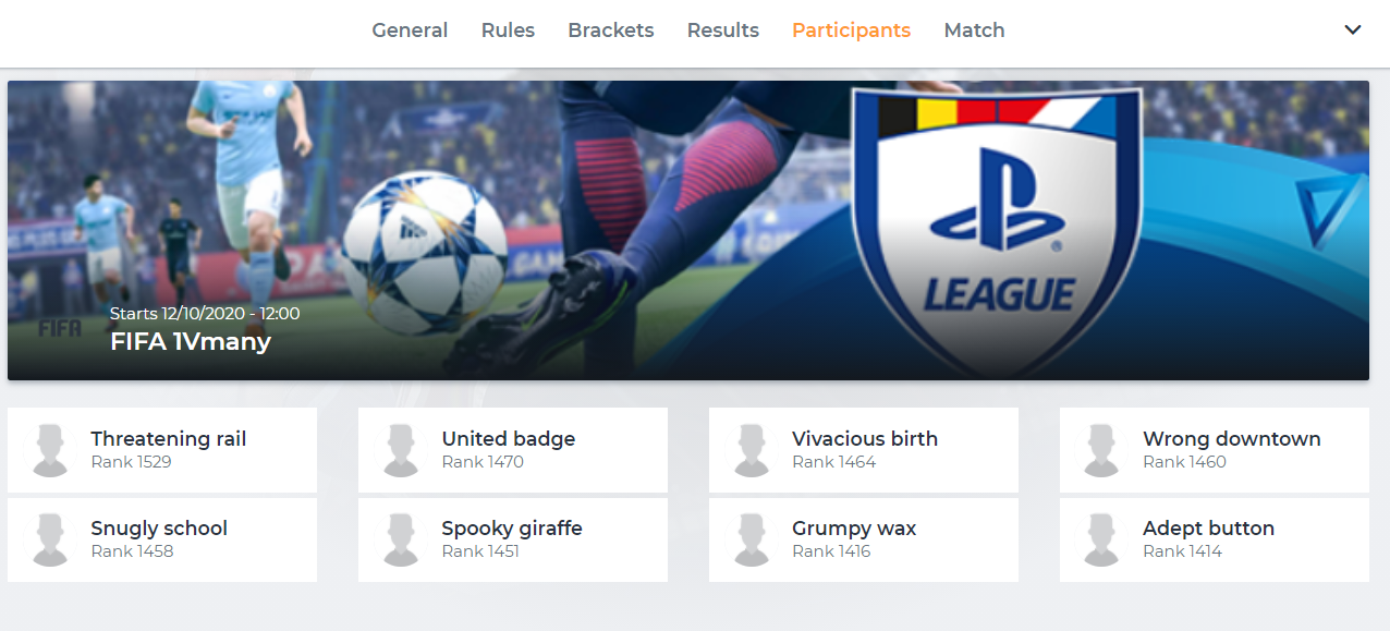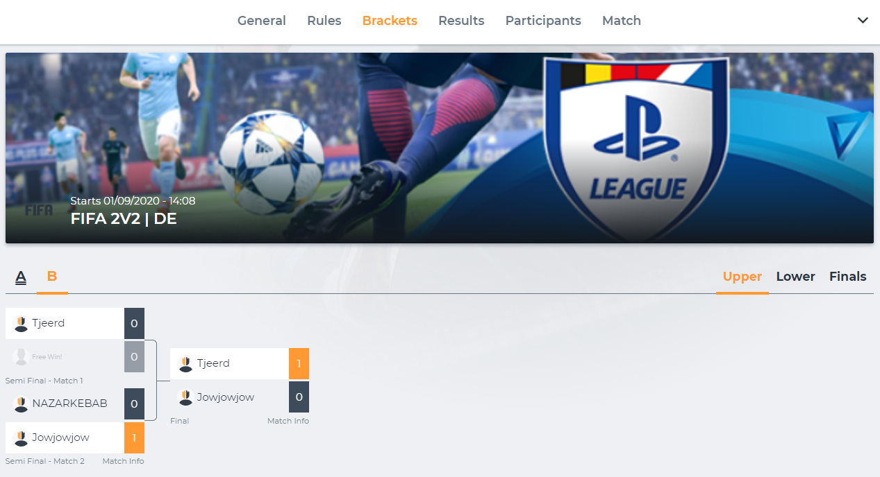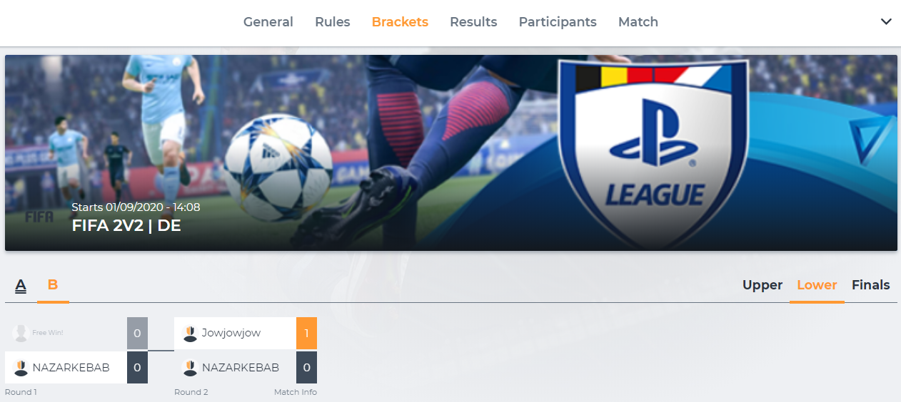 A single elimination tournament is the most basic game mode available on the platform. In this game mode all players in the tournament are placed in brackets. These brackets should consist of a total of 2, 4, 8, 16, 32, 64, etc… players. The loser of each match will be eliminated from the tournament. This means that in order to become the winner of the tournament you will need to win every match you play.