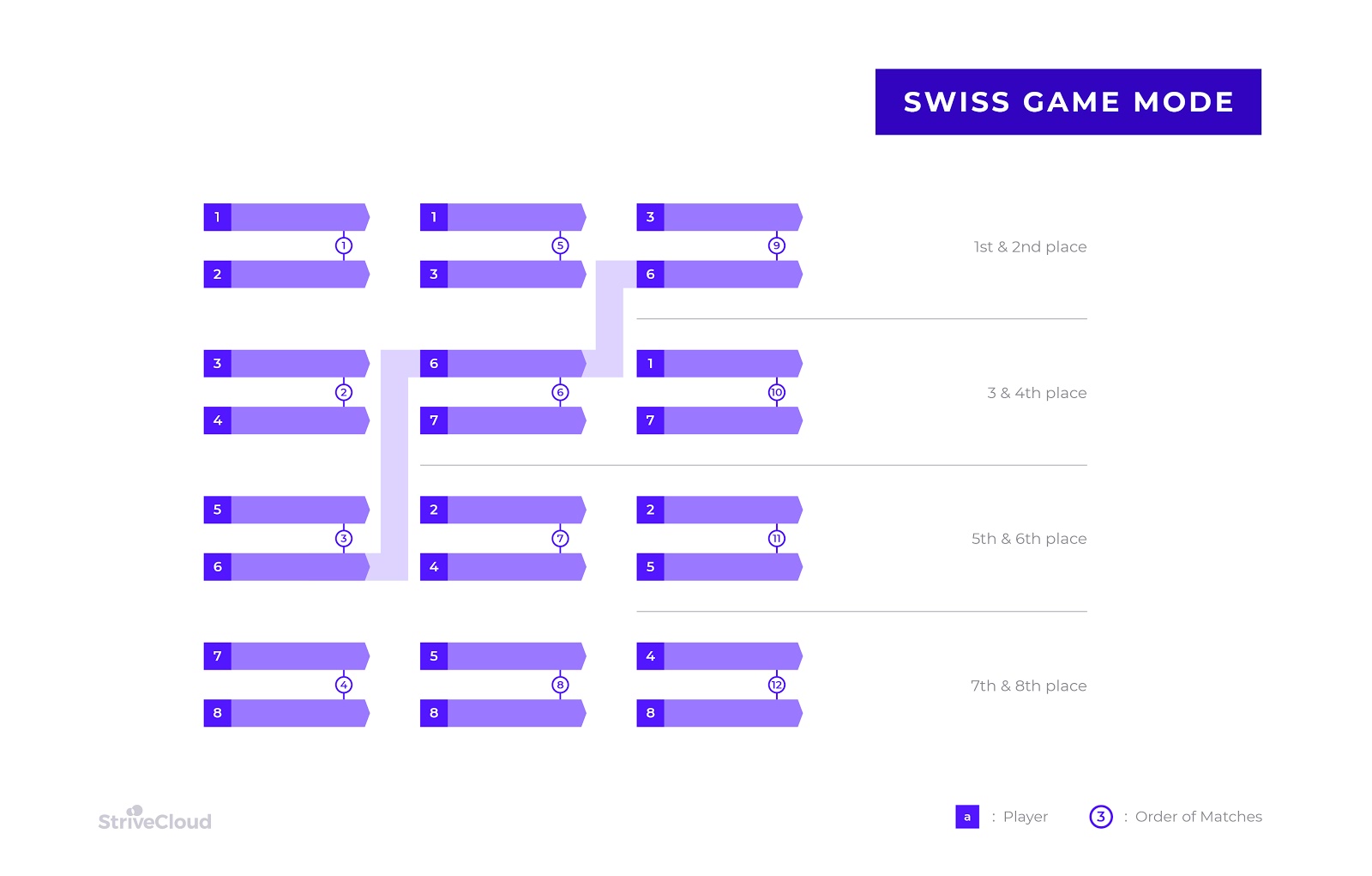 This example shows a Swiss game mode tournament, with 8 participants placed in one bracket. Every participant will play 3 matches. The roster is divided into 4 sections: 1st to 2nd, 3rd to 4th, 5th to 6th and 7th to 8th. Winning matches will allow you to progress towards a higher section of the bracket. Losing will result in moving to a lower section of the bracket.