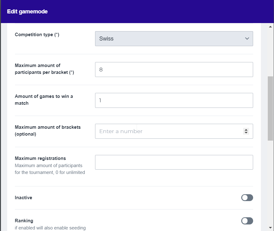 Maximum amount of participants per bracket: This determines the maximum amount of participants within a bracket. If this maximum is exceeded, a new bracket will be made
