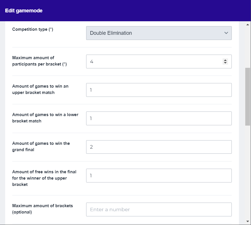 Note: the difference between the settings for the double elimination gamemode is the separate setup for ‘amount of games to win an upper bracket match’ and ‘Amount of games to win a lower bracket match’. Another difference is the ‘amount of free wins in the final for the winner of the upper bracket’