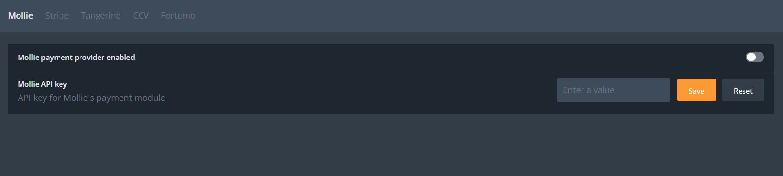 Submit Mollie’s API key to integrate the payment module on the platform.