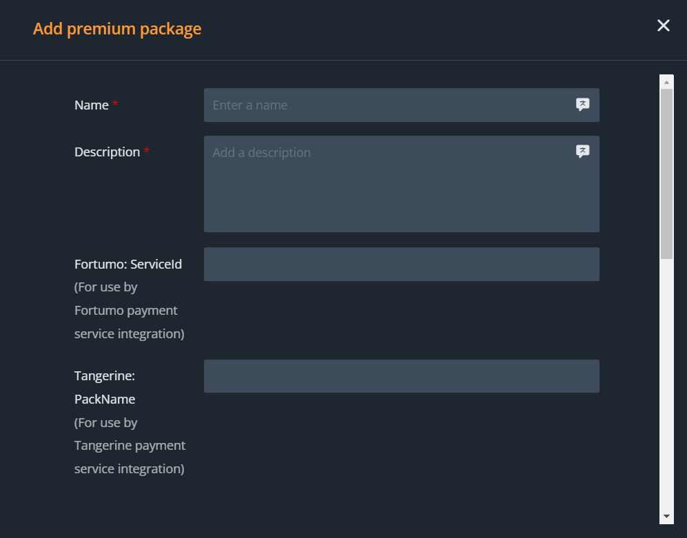 Name: Submit a name for the premium package. Description: Provide a description for the premium package. Fortumo ServiceId: Enter the required Fortumo data whenever Fortumo has been set up as a payment integration. Tangerine Packname: Enter the required Tangerine data whenever Tangerine has been set up as a payment integration. Note: more information about payment integrations can be found here. | ![]() |