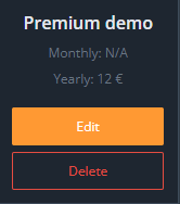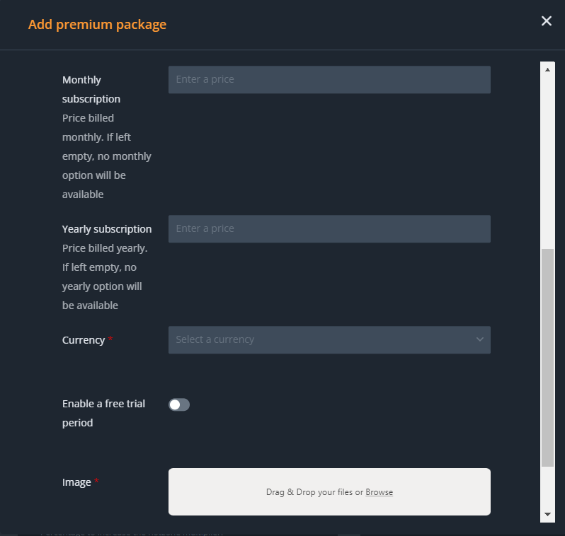 Monthly subscription: Enter the price to bill the user on a monthly basis. No monthly option available if left empty. Yearly subscription: Enter the price to bill the user on a yearly basis. No yearly option available if left empty. Currency: Select the currency need to use for payment. Enable a free trail period: Enable a trial period for the premium package. Image: Upload an image to visualize this premium package. | ![]() |