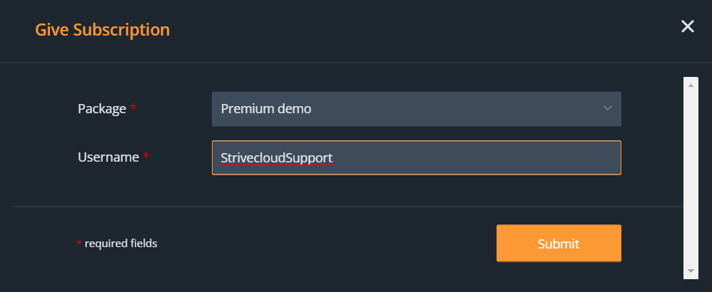 To give away a premium package to a user, click the ‘+ Give subscription’ button: