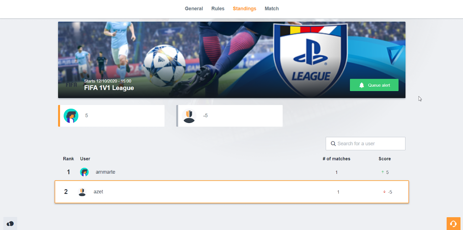 When the scrim is played and both players submitted their scores, the ‘Standings’ screen should look something like this: