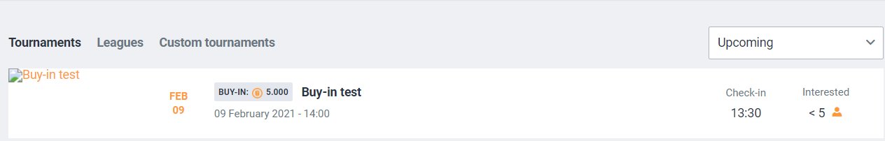 The buy-in tournament will be displayed on the tournament overview page like this: