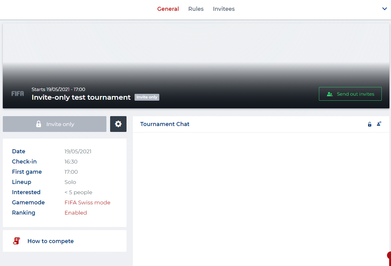 The admin will need to hand out the invites for the tournament via the ‘Send out invites’ button: