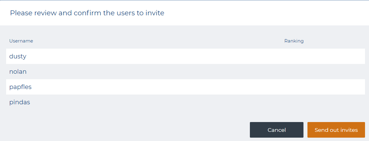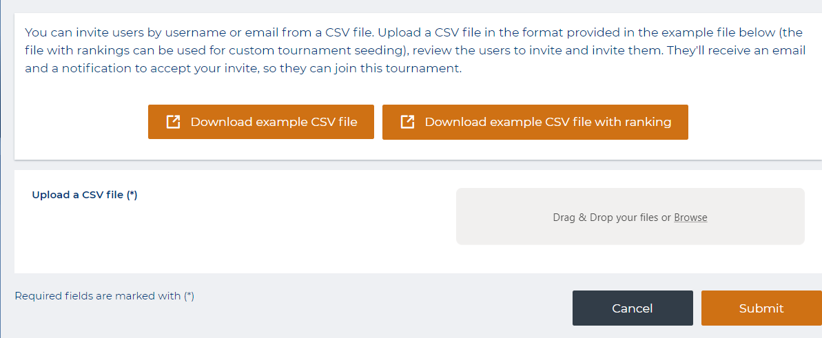 Upload a CSV file containing the usernames of the participants you want to invite to the tournament. You can choose to add a ranking for each user, allowing you to manually set up a seeding process.