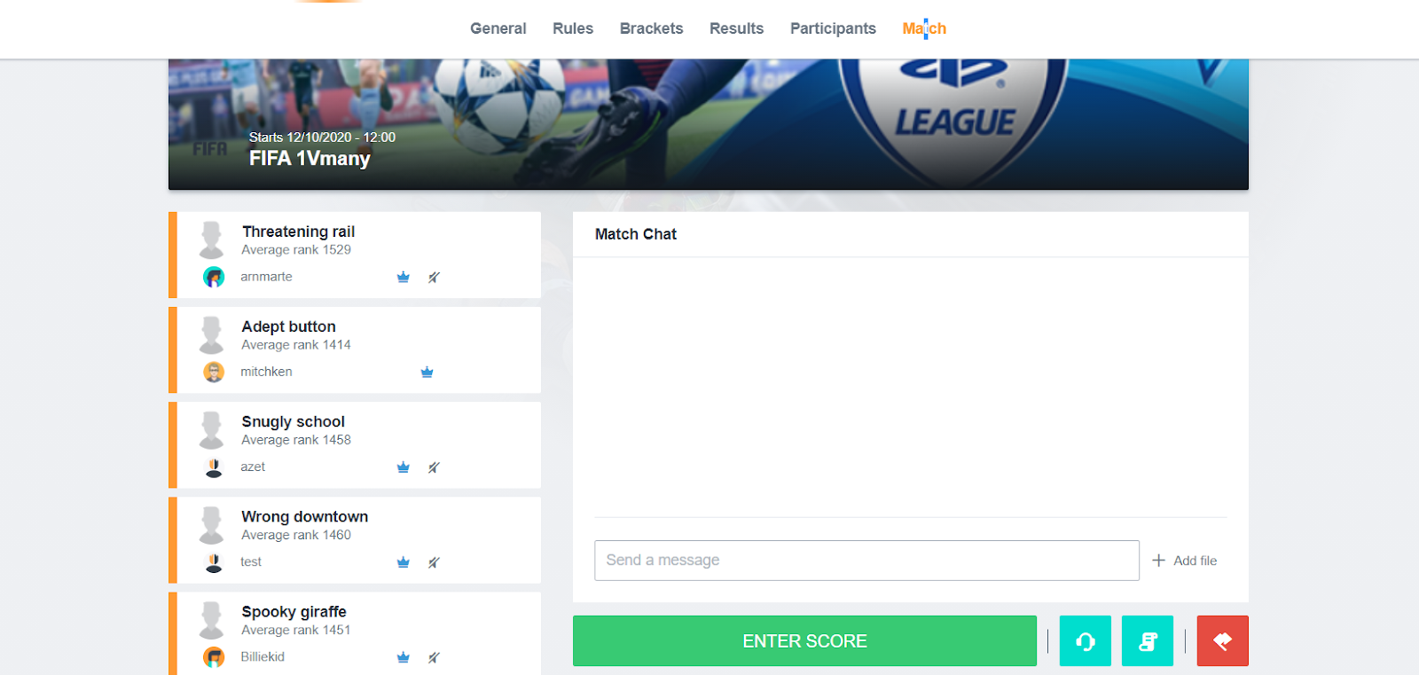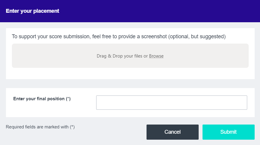 Enter your final position: Submit your score in the 1Vmany Match screen. The submitted scores will show up in the match chat. When every participant has submitted a unique position (= no equal positions are allowed), the next round will begin.