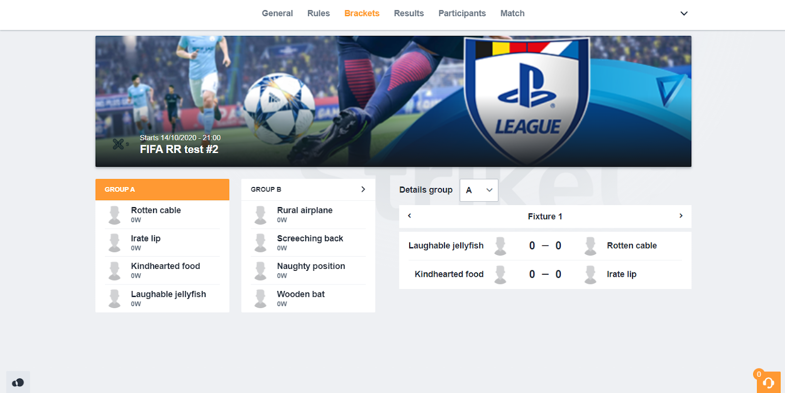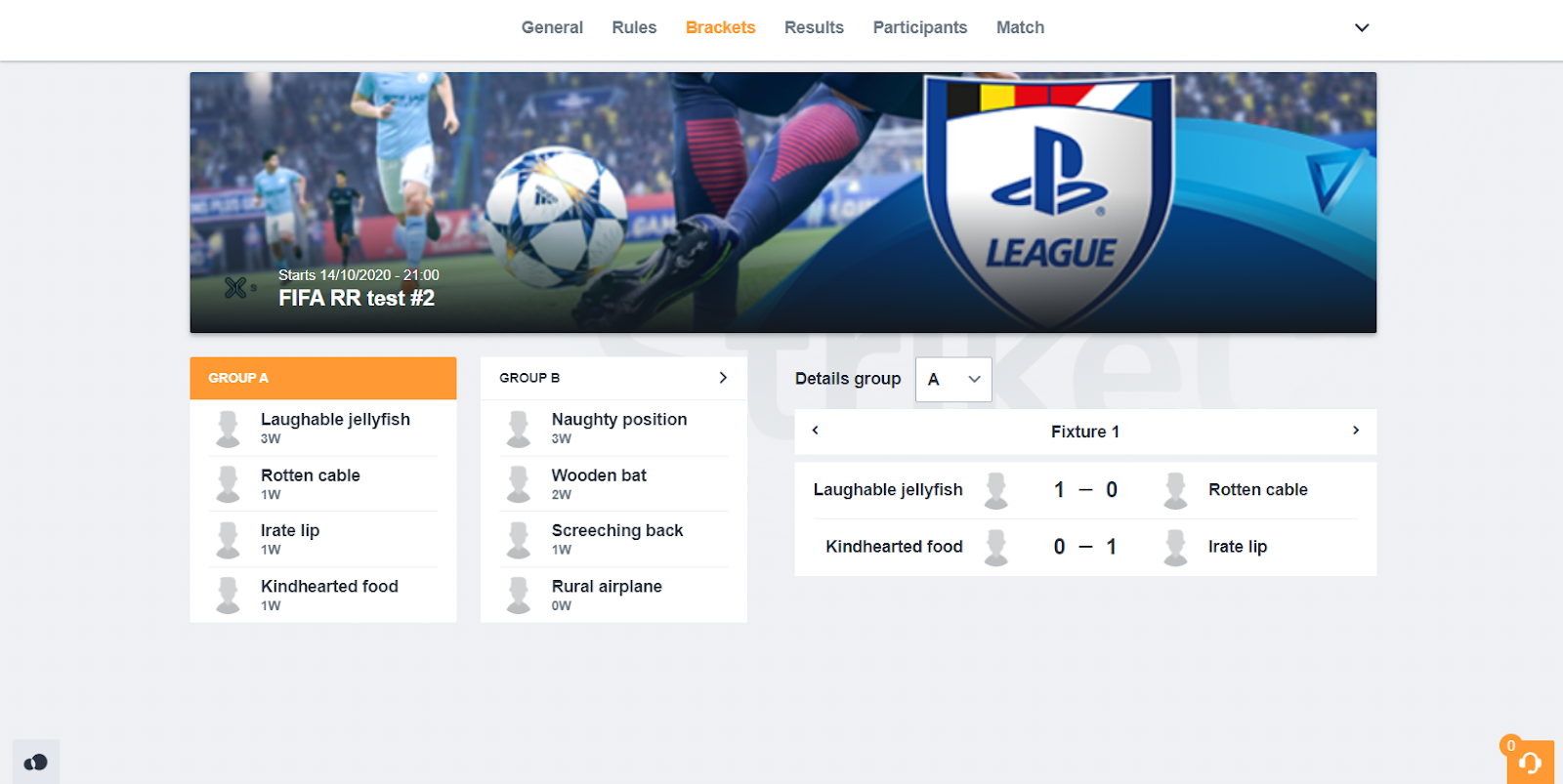 A total of 8 players signed up, divided over 2 brackets, each containing 4 participants. Every player, within the same group, will play one match against every other player. Click the ‘Brackets’ tab: