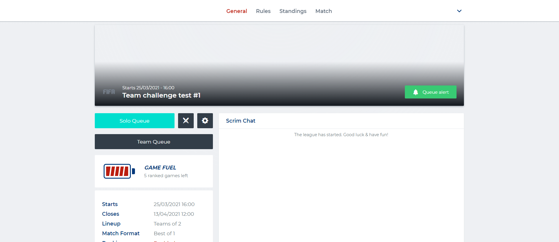 Leagues that are set up for team play are provided with a team challenge functionality. Allowing your team to directly challenge another team to play a match.