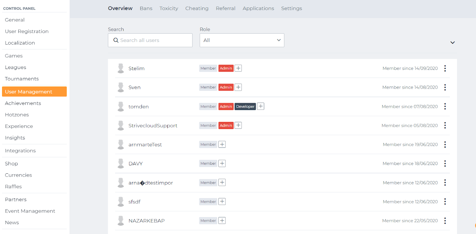 This part of the control panel allows you to manage and assign the roles and statuses of your user database in an easy way.